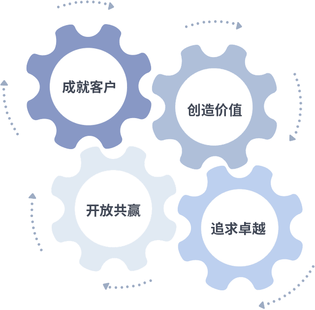 成就客户是一切决策的出发点,,,创造价值是衡量所有工作的标准,,追求卓越是我们做事做人的态度,,开放共赢是我们的格局也是最终的结果。。。。价值观的齿轮环环相扣,,,,推动着组织里的每个人不断向前。。。